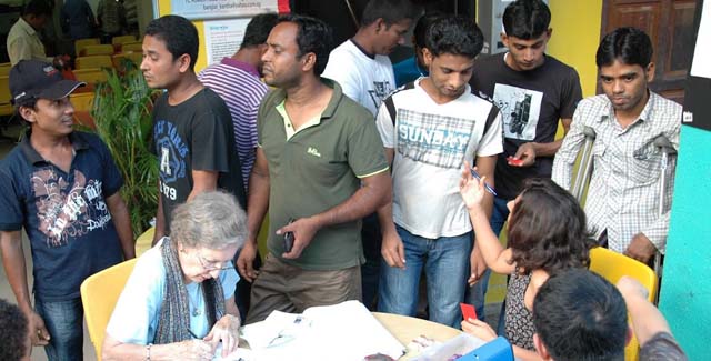 And for the workers, TWC2 volunteers are there to listen to each man’s experience, then to offer advice as to his rights and the options he may have in pursuing his claims. The more senior volunteers help by writing to the Ministry of Manpower, hospitals or the police to expedite cases.