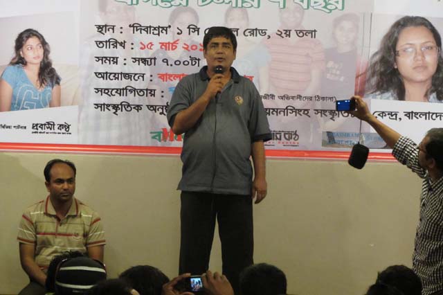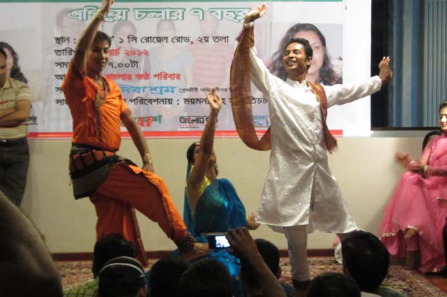 After dinner and dessert, many of the men streamed upstairs to the drop-in centre Dibashram, run by TWC2 executive committee member Debbie Fordyce and A K M Mohsin, publisher of Bengali newspaper Bangla Kanthar. A K M Mohsin had singlehandedly arranged a show, featuring a famous actress and five other dance artists from Bangaldesh. Before the main act however, Bangladeshi workers in Singapore provided the crowd warmers, reciting poetry they had composed themselves, that told of homesickness, aching bodies and longing hearts. Another worker was invited several times to sing and some of the songs he chose were obviously popular, with other workers mouthing the words along.