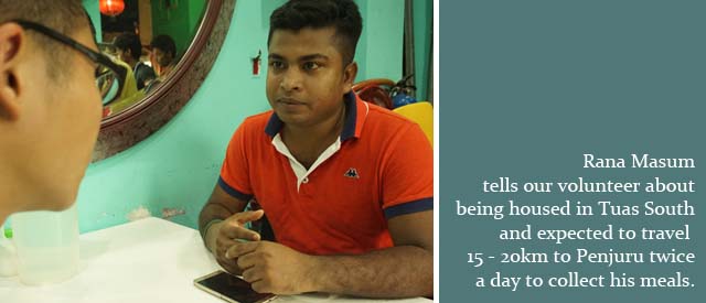Exiting the ministry, Rana asked his boss where his meals would come from if he didn’t stay at the usual dormitory. Rana was then told to travel every morning and evening to the company office in Penjuru (in the Jurong East area) to pick up his food. That’s 15 – 20km away by road. Not only would that be ridiculously time-consuming, when Rana asked about transport expenses, “Boss say, ‘he don’t care and don’t want to know’.” Even more preposterous was his boss’ impractical suggestion that Rana cycle from South Tuas to Penjuru every day to collect his food when the man does not even know how to cycle.