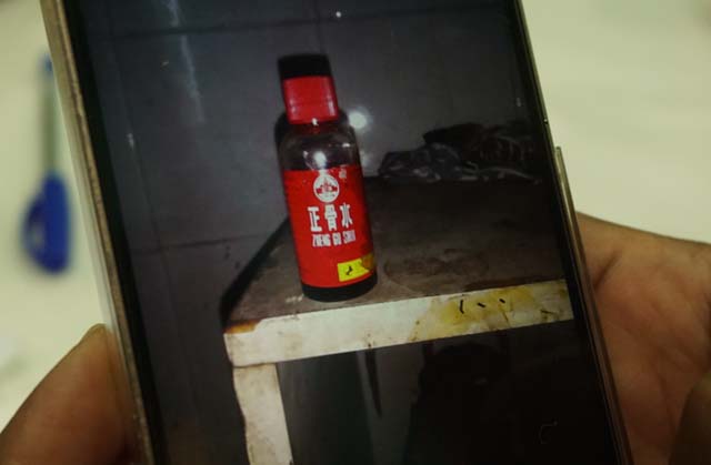 For the pain, his boss instead gave him “chinese medicine”, said Rana Masum, to rub on his finger. He had no idea what exactly it was, but he had a photo of it on his phone. He shows it to me. All the label said was “Zheng gu shui” (正骨水) which can be translated as “liquid for strengthening bone”.