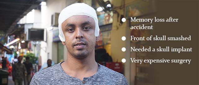 But Sorowar was now left with half his skull missing. There was only soft skin covering the entire frontal cortex and more. It’s impossible to live a normal life like that. He would be highly vulnerable to heat with possibility of epileptic fits, and certainly to any bump on the head. Dizziness would strike each time he stood up. Doctors recommended that he should have a skull implant. The problem was that the employer had exhausted their insurance amount.