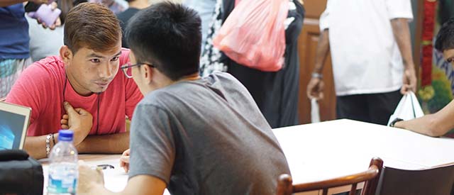 You are now between jobs. You’re confident that you can find stable work but, alas, you cannot apply for such jobs because your hands are tied by MOM’s regulations. You are confused and perhaps a little scared about your future because it seems so out of your own control. But you do not betray your confident demeanour. The volunteers from TWC2 are still giving free food and a listening ear, so you visit regularly to talk and feel at home, and now you are talking to this new volunteer who is writing your story down which will perhaps be read by other people so they know what you are going through. You have finished telling your story and the senior volunteer whom you like — who is friendly and jokes with you — tells you that you can go but you hesitate for a moment, not wanting the happy moment to expire, and feeling maybe a little scared after recounting your story. You laugh to brush away your vulnerability. Yet, you are feeling hungry so you take a meal token from a volunteer, collect your food and sit down to have a meal with other men like you. Men with their own stories of injustice, whose fates are not theirs to decide, who are left dangling not really knowing what to do.