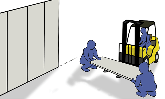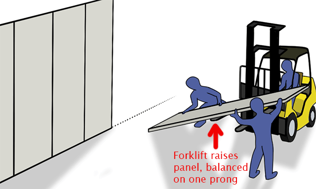 Now the panel had to be moved into an upright position. How this was done was to keep one end of the panel touching the ground while the forklift lifted the other half of the panel.