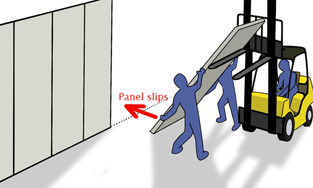 When the panel had been raised to about 60 degrees’ incline, it suddenly slipped at the base. It was too heavy and too sudden for the men to maintain control of it.