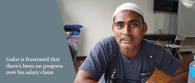 Gafur has had a turbulent time since the day he arrived in Singapore. In the space of seven months, he went from the hope of steady work abroad to the frustration of being stuck without work and pay. Borrowing money from relatives to pay for rent and food, he is eager to recover his outstanding salary and move on. As he sits with me and shares his story, however, it is clear he has had no such luck.