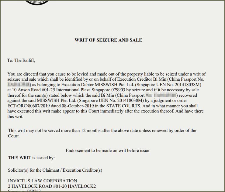 Invictus Law volunteered to help and together we decided to try the WSS route. We would apply for a writ and, when issued, we’d seek the help of a court bailiff to enforce it. The assets of the employer would be tagged and seized and put up for auction to raise the money to pay Bi Min. It would be highly disruptive to MissWish’s business, no doubt, but employees deserve their salary.
