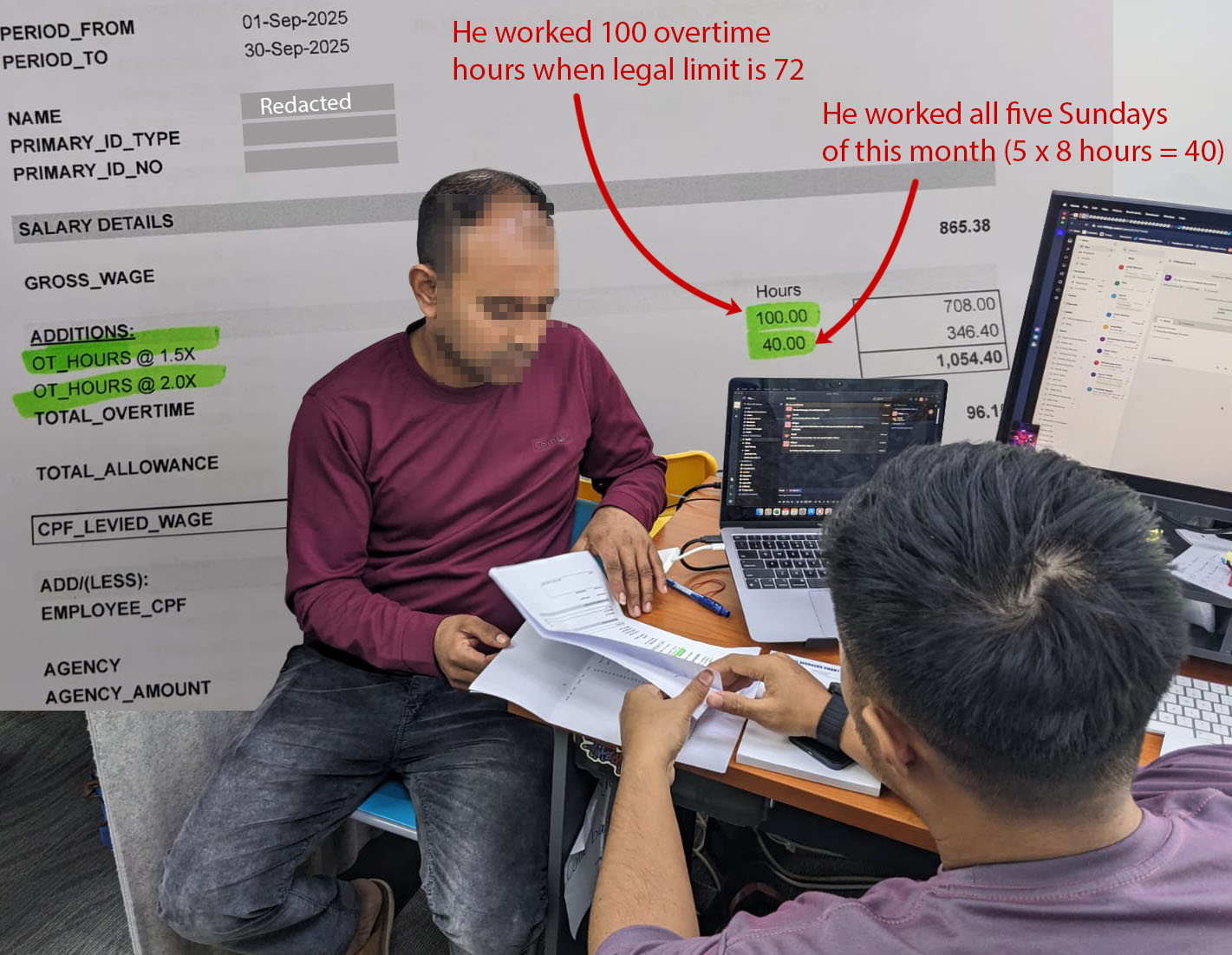 A worker showing his payslips to a TWC2 case officer – payslips that show excessive overtime, and rest days forgone